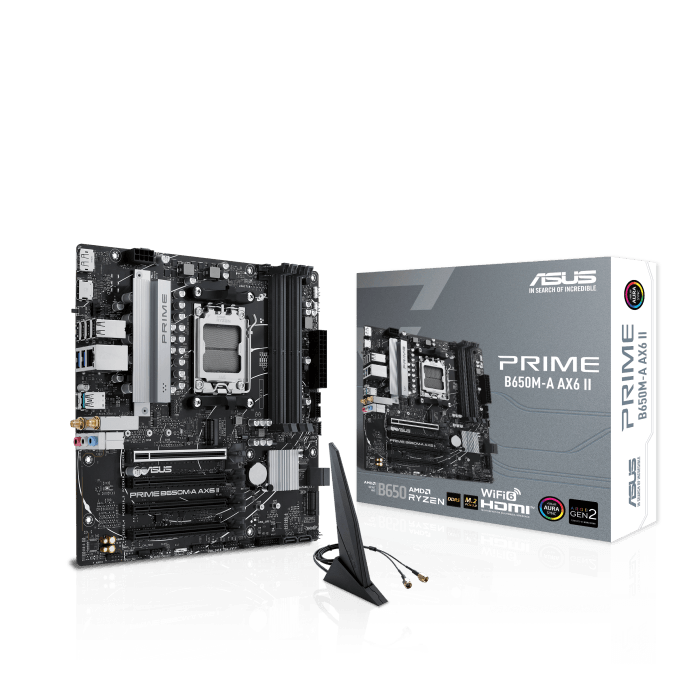 Placa madre ASUS PRIME B650M-A AX6 II con socket AM5, soporte para memoria DDR5 y conectividad WiFi 6, diseñada para procesadores AMD Ryzen™ de última generación. Ofrece una base sólida, refrigeración eficiente y amplias opciones de expansión.