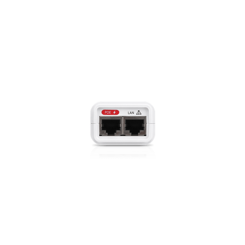 Inyector PoE Gigabit de 24 V DC y 24 W, diseñado para alimentar dispositivos Ubiquiti compatibles, proporcionando energía y datos a través del mismo cable Ethernet.