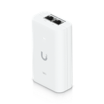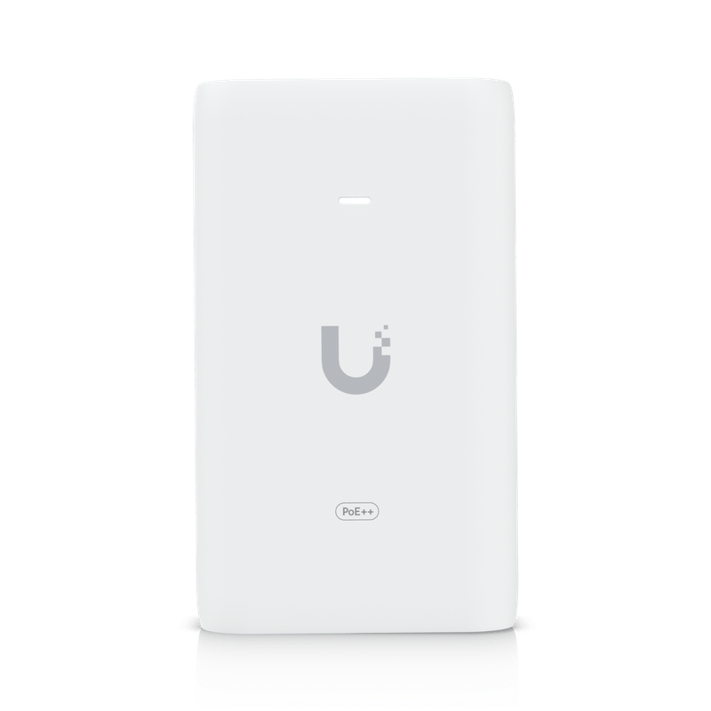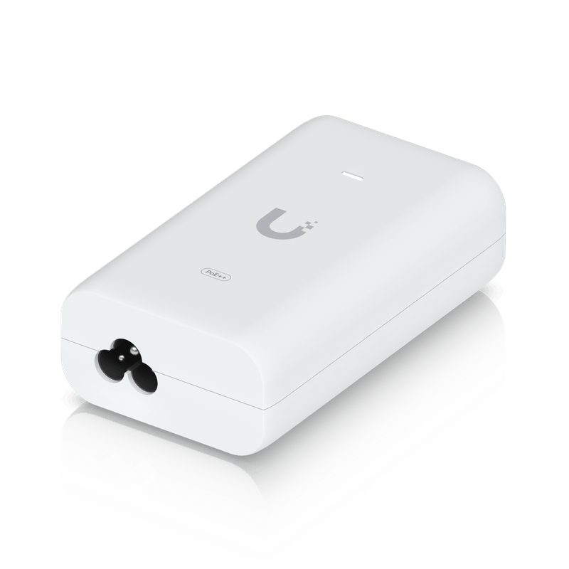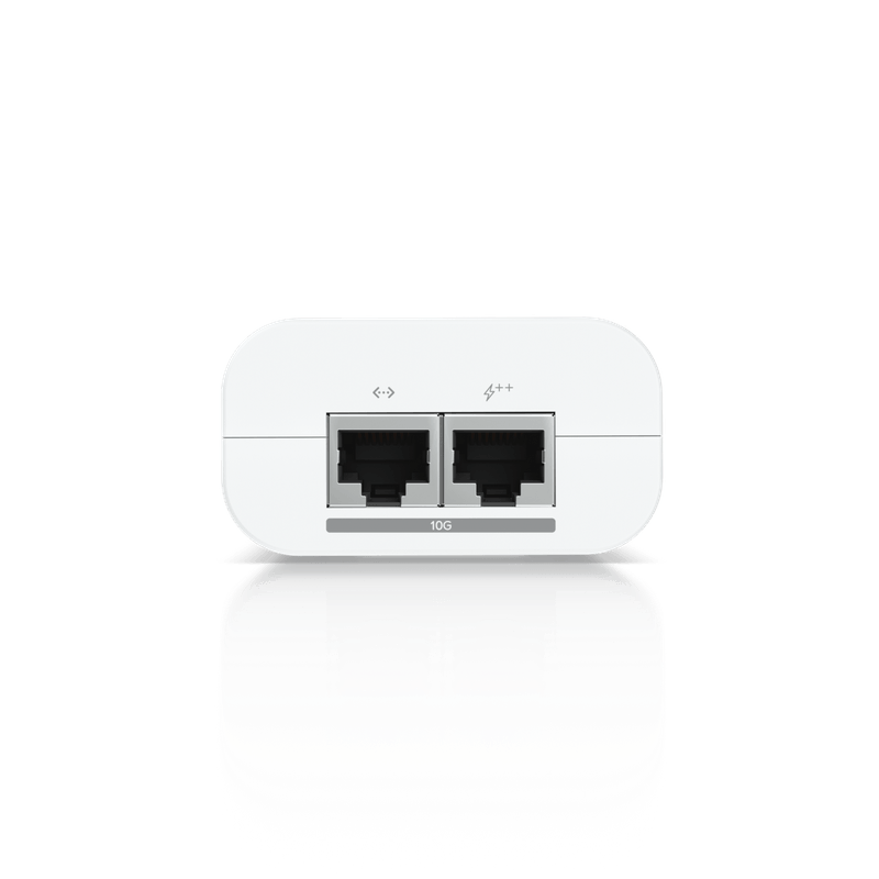 Inyector PoE++ de alto rendimiento con puerto 10 Gigabit, diseñado para alimentar dispositivos UniFi que requieren hasta 60 W, combinando datos y energía en un solo cable Ethernet.