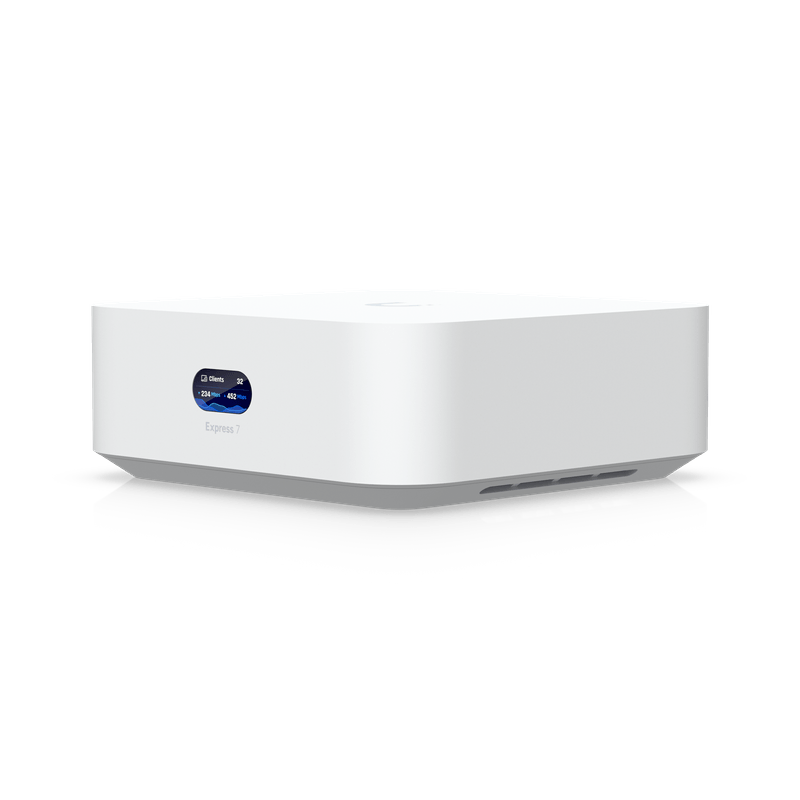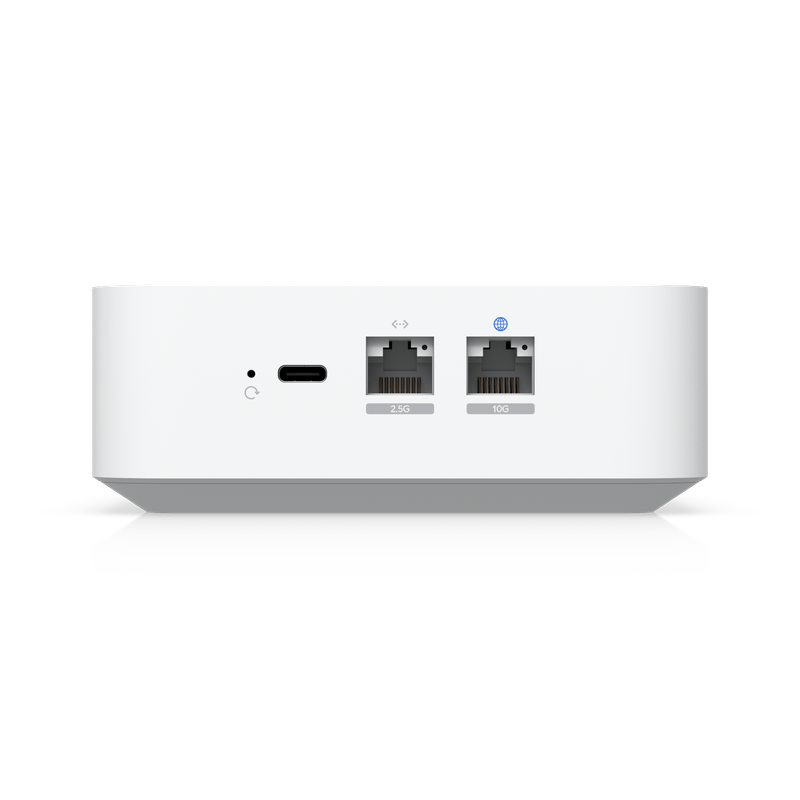 Pasarela UniFi compacta con Wi-Fi 7 integrado, WAN 10 GbE y LAN 2.5 GbE, ideal para hogares y pequeñas oficinas con alta demanda de ancho de banda.