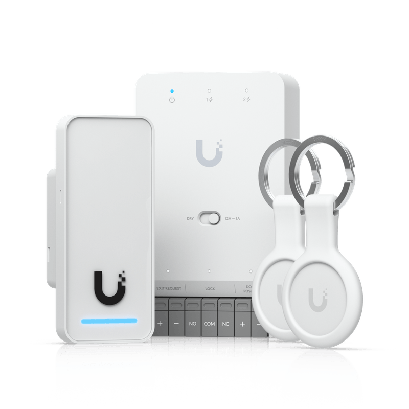Kit todo‑en‑uno para una puerta con lector G3, hub Door Mini y llaveros NFC, gestionado desde UniFi OS.