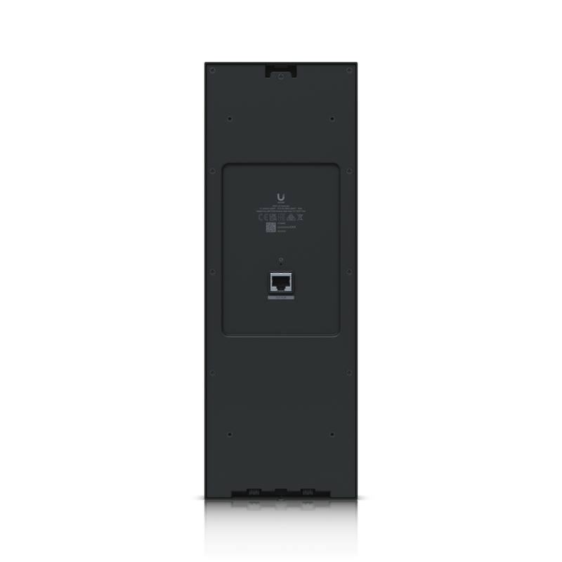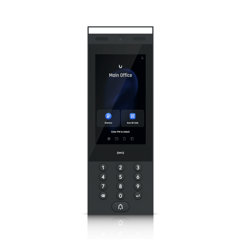 Terminal de intercomunicador con cámara integrada, lector NFC, PIN y botón de timbre para control de acceso.